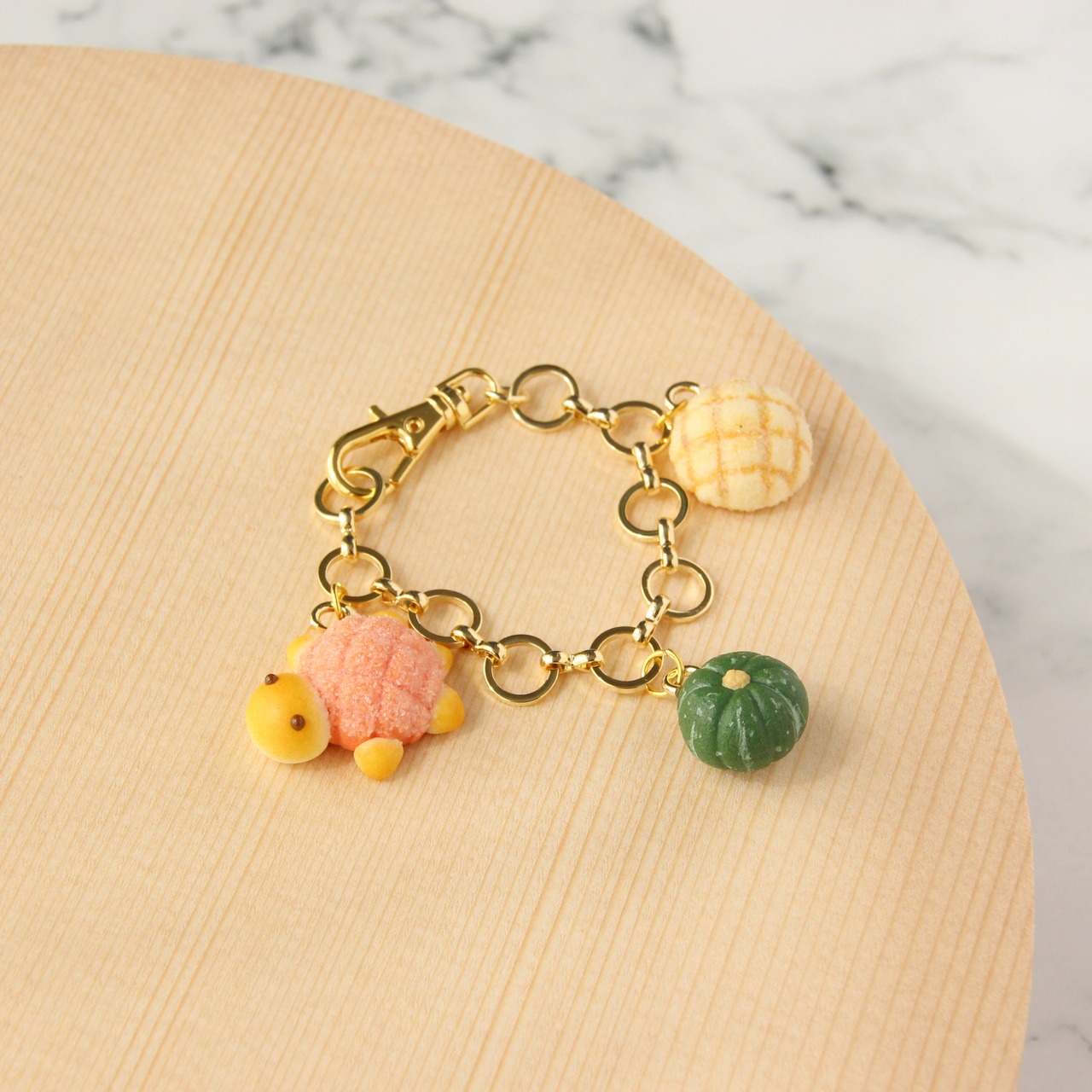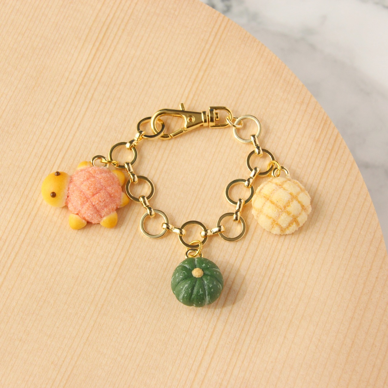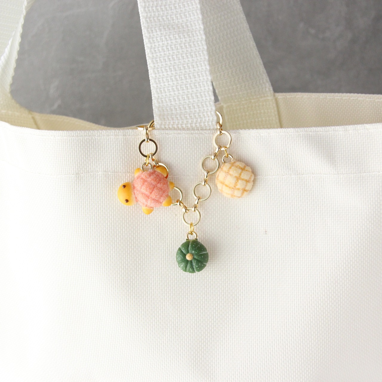 かぼちゃ色の甲羅に大きめの頭とつぶらの瞳の可愛いカメロンパン、カリカリザクザクのメロンパン・緑のちいさなかぼちゃのバッグチャーム