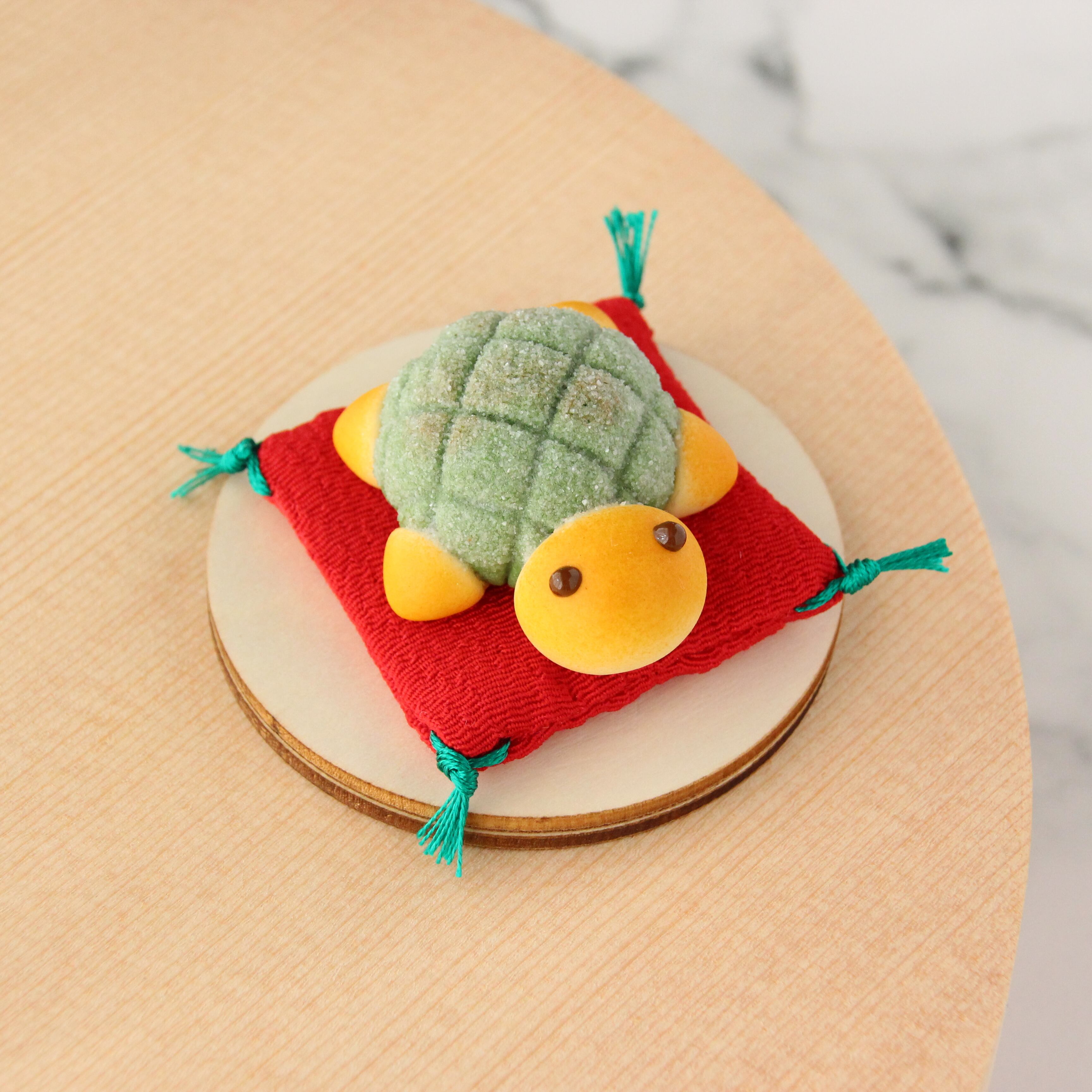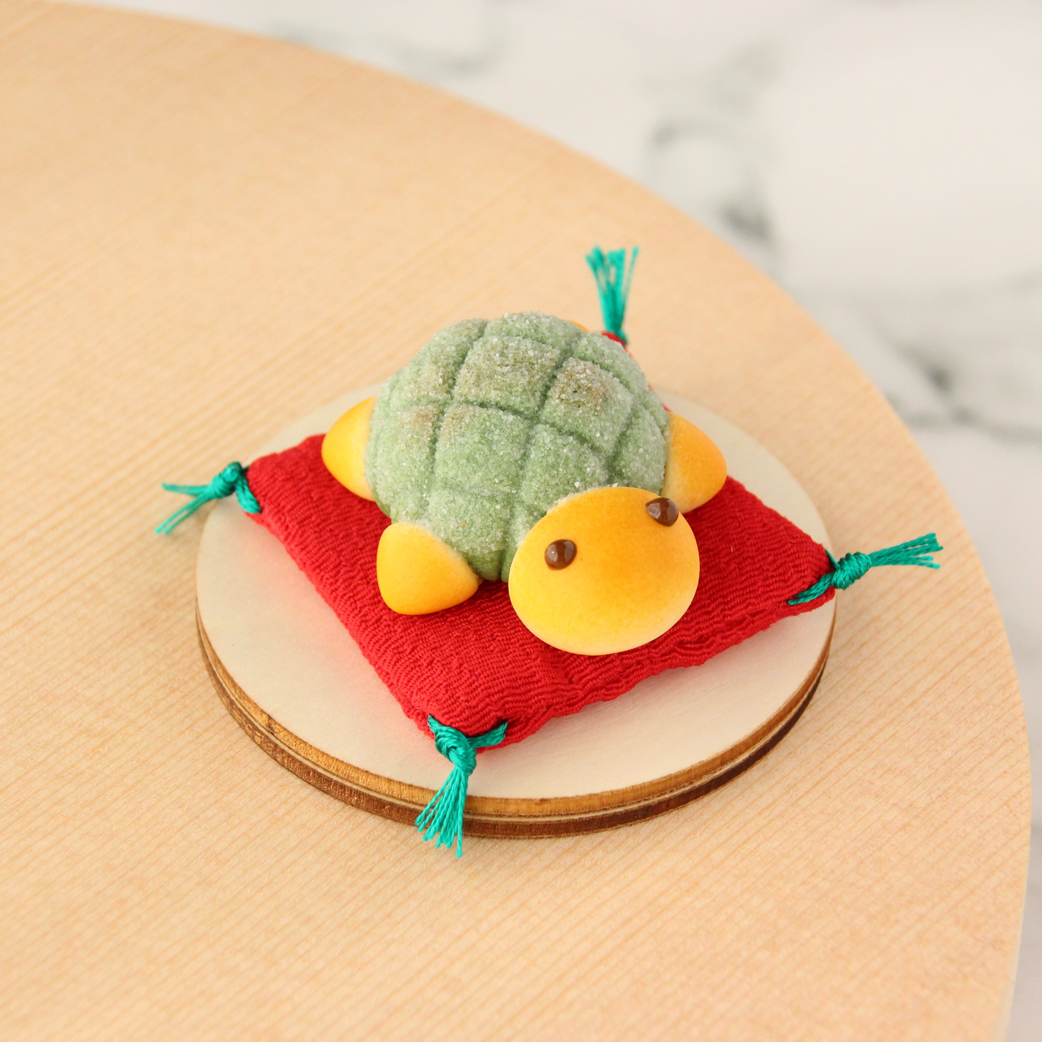 大きめの頭とつぶらの瞳の可愛い親子カメロンパンを木製プレートに乗せて飾れるインテリアです。